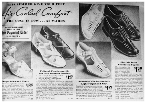 Anyway, for most people in the western world sandals took off in the 1930s with the advent of casual wear. Before then oxfords ruled for men with saddle-shoes as the casual alternative. In this ad 1938 you can see a trajectory from traditional shoes with broguing added for ventilation, to adding a T-bar, to adding more straps, and finally on the far left, straps only: