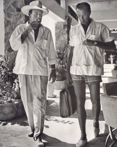 Lesson two is look at these outfits. Below we have Cooper with John Wayne in Acapulco in 1953. Cooper wears little plaid shorts. A light-coloured guayabera (the shirt) with traditional four-pocket detail at the hem sets off his deep tan. The eye follows his shapely legs down to well-turned ankles delicately bound by the strings of his espadrilles. John Wayne rips a cig.
