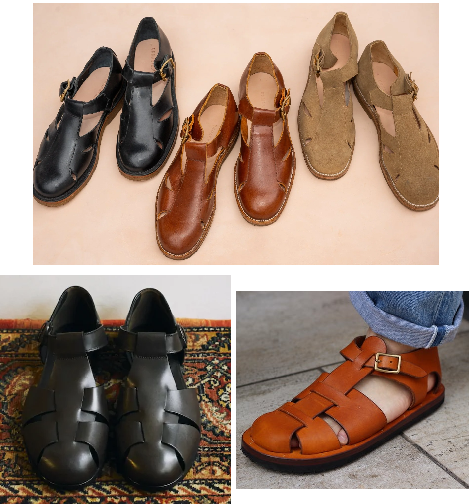 This elegant and practical style is based on military footwear worn by Nepali soldiers in the 19th Century. The form is kind of similar to a fisherman sandal, with straps over the foot connected to a central piece, but more enclosed and with fewer straps. This is a serious and respectable shoe. I find the vibe is a bit GQ and there’s not a lot of coquetry going on here, but it’s not all about me. These are a handsome and versatile option.
