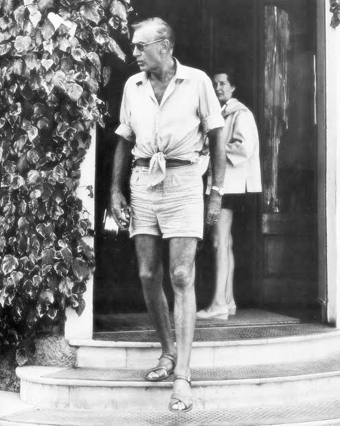 Here we have a more weathered Cooper in 1956 in the French Riviera, still delivering lethal levels of outfit. The little shorts are gingham this time and his shirt is tied at the waist. He wears simple leather sandals with straps crossed over the toes and a buckled strap around the ankle. The woman in the background is his wife Rocky, who also looks chic, but that’s not what we’re here for.