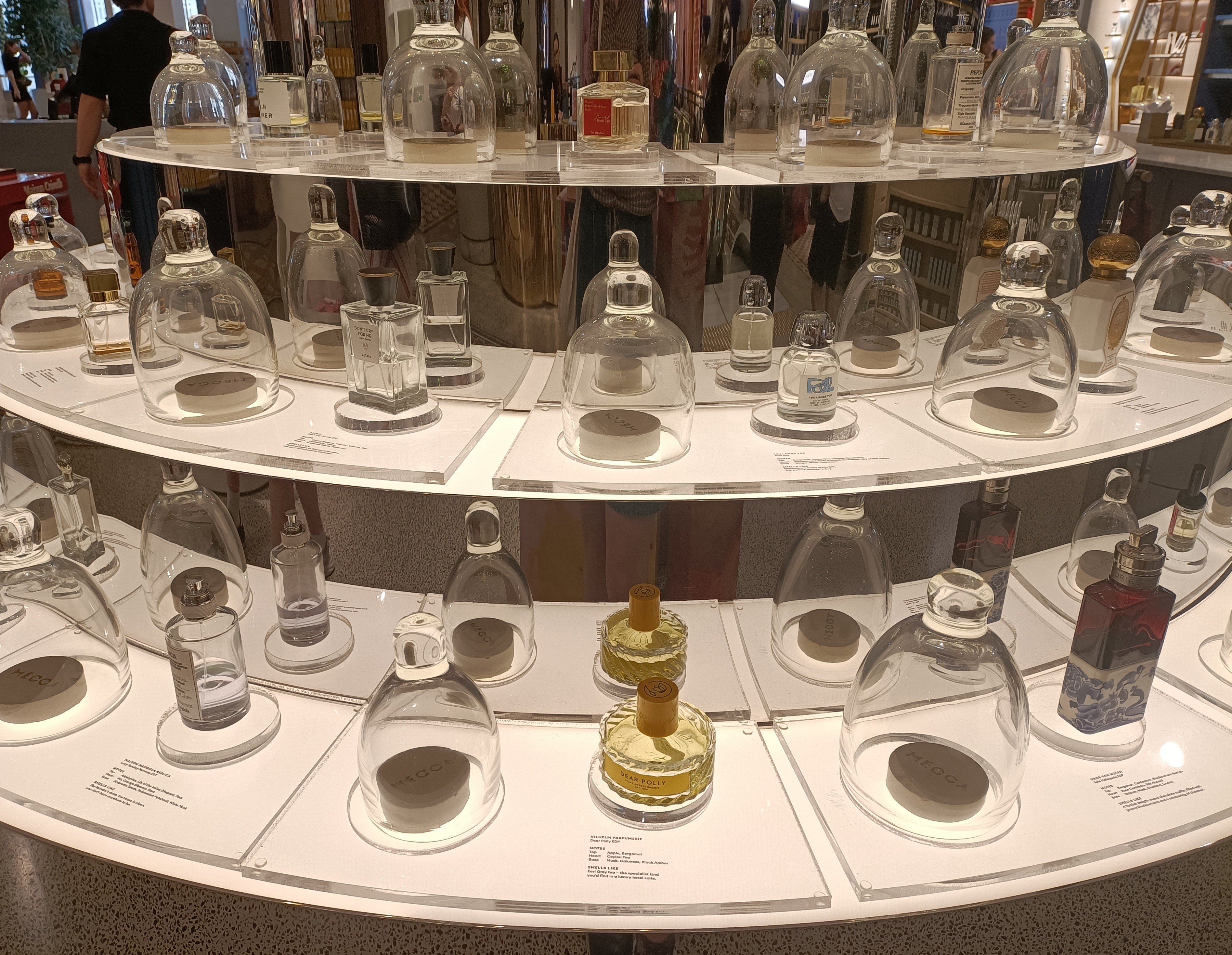You ascend to the upper level. There is an auditorium here where worshippers are initiated into the mysteries of advanced aesthetics. You pass a counter for permanent jewellery, which sounds like a threat. All throughout the temple complex there are priests, priestesses and oracles. There are hidden chambers where rituals of peeling, laser and needling are carried out. After these discreet mortifications of the flesh, cultists can visit the tea rooms to recover. You are not devoting yourself at that level today. At the shrine to Margiela you caress a candle dedicated to the hearth. Touch enhances connection to divinity. It doesn’t even have a price on it and you’re afraid to ask. You are facing the big windows again, from the inside this time. The upper level is radiant and intricately tiled. You approach the most intricate shrine of all, shining with glass cloches and bottles.