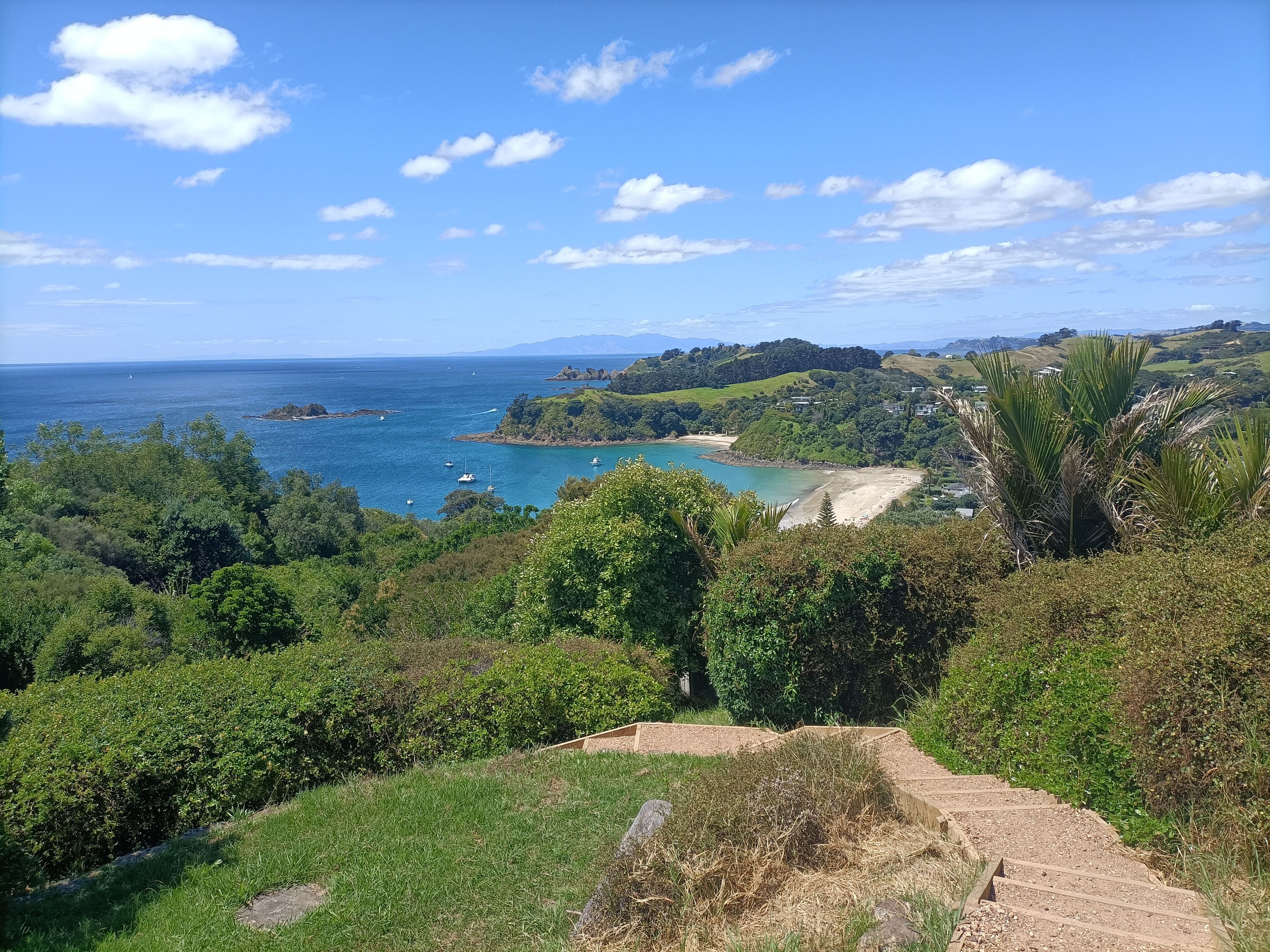 The track goes up through pretty and verdant bush. The climbs are not long and come to frequent beautiful views of the coastline, beaches and hundreds of boats. I don’t see anyone else walking on the trails the whole day, I’m not sure what everyone else who came on the ferry is doing, maybe wineries. Some sections of the walk are just road, but it’s not bad. The roads are all small and no one is driving fast. It feels very free and open. There’s a tension between that feeling and all the mansions (the average property value here is $1.6 mil), some of which are flying the New Zealand flag. I don’t know how to explain why that’s weird but you probably already get it. I’m aware that this is a very paywalled area. There are only about a dozen Kāinga Ora units and homelessness in Waiheke is the highest per capita in the Auckland region.